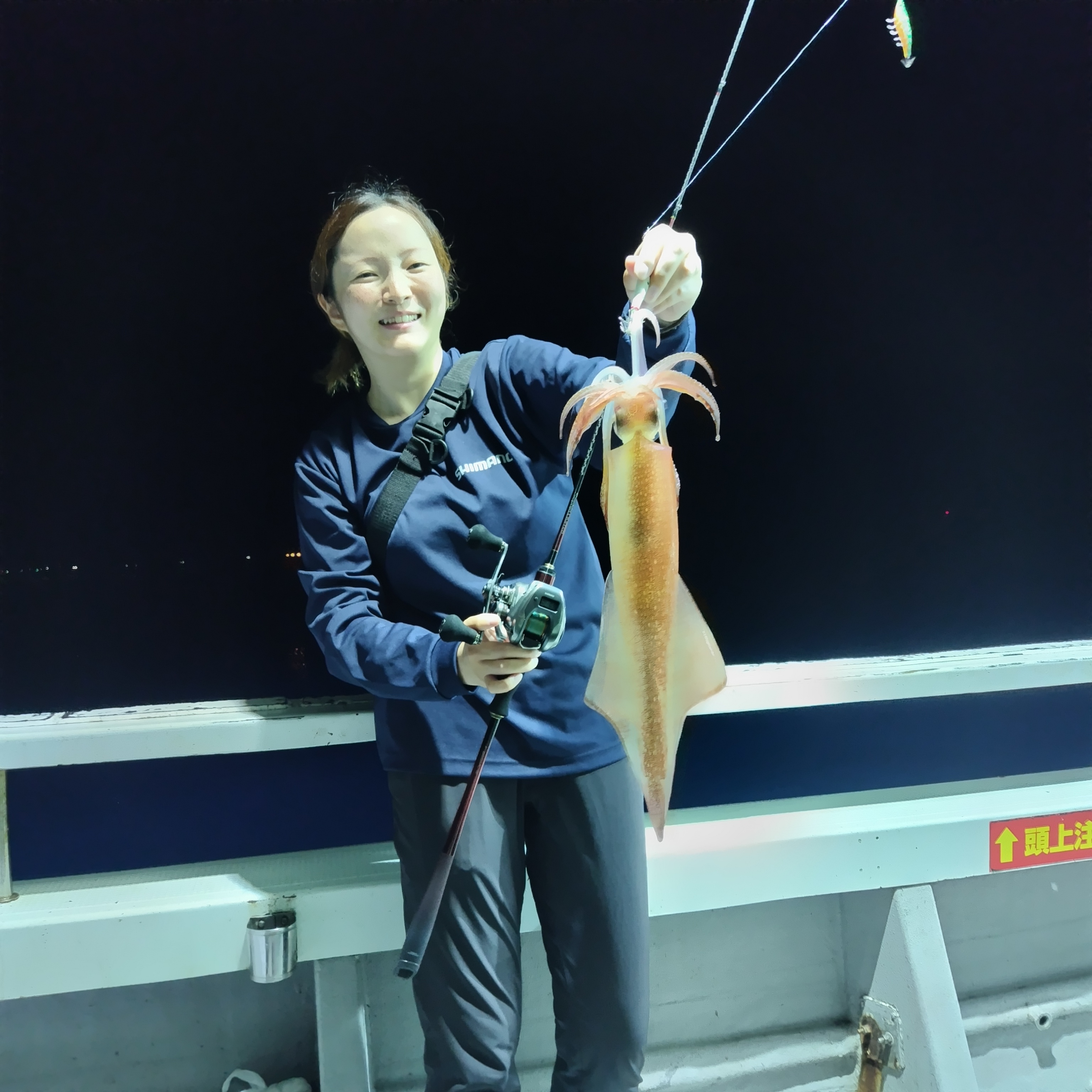 二ヶ所目のポイント到着後すぐにケンサキと特アジが釣れだしホッとしたのも束の間、弱い風と弱い潮が喧嘩して船があっちいったりこっちいったり…。